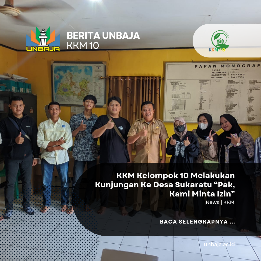 Senin (12/6) Kelompok 10 Kuliah Kerja Mahasiswa (KKM) Universitas Banten Jaya (UNBAJA) melakukan kunjungan ke Desa Sukaratu, Kecamatan Cikeusal, Kabupaten Serang – Banten. Kunjungan ini merupakan upaya Kelompok 10 untuk melihat secara langsung kondisi di desa tersebut. Mengawali kunjungan tersebut, Kelompok 10 mengunjungi Kantor Desa Sukaratu untuk memperkenalkan diri serta sedikit berbincang mengenai potensi yang dapat dikembangkan di desa tersebut sekaligus meminta izin untuk mendiami desa tersebut selama mereka melakukan kegiatan KKM. Dalam perbincangan tersebut salah satu staf desa mengatakan bahwa di Desa Sukaratu terdapat Program Kampung Bersih. Selain itu,…