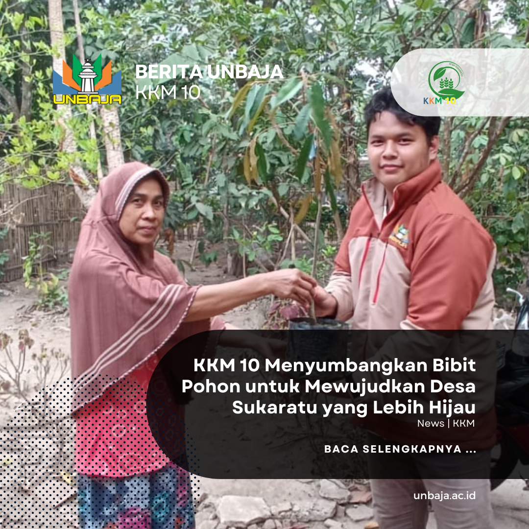 (25/8) KKM 10 Universitas Banten Jaya dalam menjalankan salah satu program kerja unggulan yaitu menyumbangkan bibit pohon di salah satu kampung yang ada di Desa Sukaratu. Kegiatan tersebut mendapat dukungan penuh serta didampingi oleh Perangkat Desa. Kampung yang menjadi pilihan adalah Kampung Pabuaran Asem yang merupakan kampung yang pernah menjuarai Lomba Kampung Bersih Aman (LKBA). selain itu, di kampung tersebut juga terdapat Kelompok Wanita Tani (KWT), sehingga bibit pohon tersebut diserahkan kepada Ketua KWT.