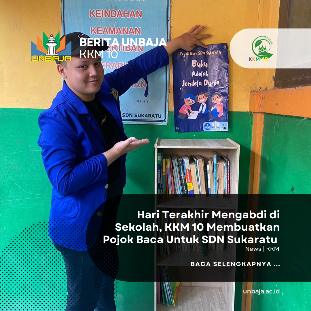 (2/9) KKM 10 berpamitan dengan Guru dan Siswa di SDN Sukaratu. Sebelumnya kami berencana membuat sesuatu yang dapat dikenang dan bermanfaat untuk Siswa. Pada akhirnya kami sepakat untuk membuat pojok baca karena kami melihat di sekolah tersebut belum memiliki tempat untuk para siswa dapat membaca bersama. Pojok baca yang kami buat sangat sederhana bermodalkan Rak dan Buku hasil dari donasi. Namun, kami berharap agar pojok baca tersebut dapat menjadi pemicu para siswa agar menjadi rajin membaca.