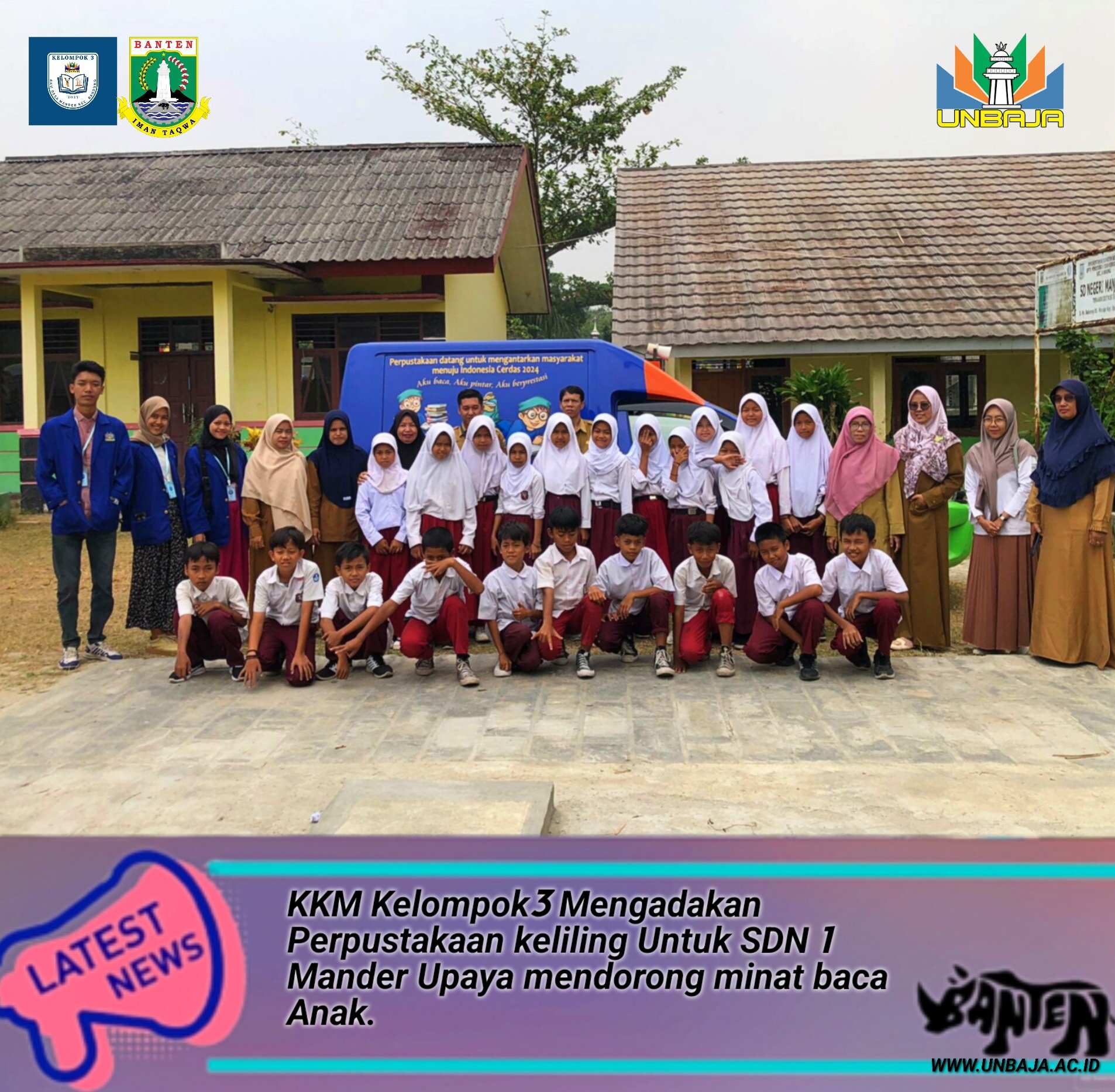 Pada tanggal 29 Agustus 2023 bertempat di kab.serang Banten kami KKM Kelompok3 Mengadakan Perpustakaan Keliling Untuk anak-anak SDN 1 Mander,kami berharap dengan kami mendatangkan perpustakaan keliling ini akan memacu keinginan dan minat baca anak, antusiasme anak-anak dan bapak ibu guru di SDN 1 mander saat menyambut kedatangan mobil perpustakaan keliling membuat kami yakin anak-anak SDN 1 mander sangat suka membaca,ini semua kami upayakan agar menambah wawasan pengetahuan anak-anak.