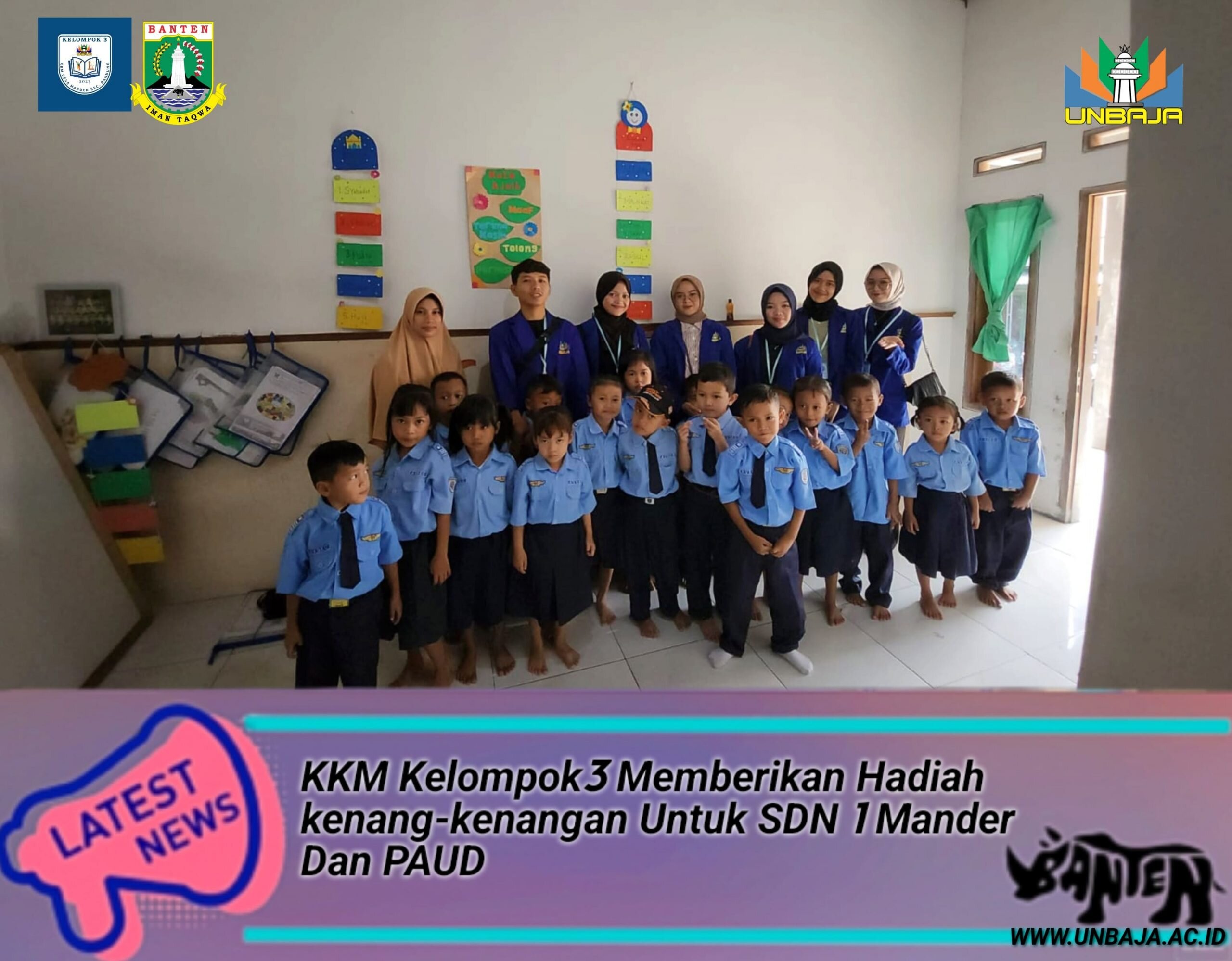 kami kakak-kakak mahasiswa universitas Banten jaya dari KKM Kelompok3 memberikan hadia kenang-kenangan untuk SDN 1 mander dan PAUD supaya anak-anak dan bpk/ibu guru di tempat selalu dapat mengingat kami, bahwasanya kami pernah mengajarkan berbagi canda tawa dan berbagi sedikit ilmu yang kami ketahui untuk anak-anak SDN 1 Mander dan PAUD, sungguh berat rasanya karena,memang benar sangat benar jika ada kata-kata (tak kenal maka tak sayang) kalian semua khususnya warga desa.mander sudah seperti keluarga sendiri,banyak sudah momen-momen seru penuh cerita canda tawa yang kita lalui bersama warga Desa.mander Kec.bandung Kab.serang Banten yang tidak akan pernah kakak-kakak mahasiswa bisa melupakannya.