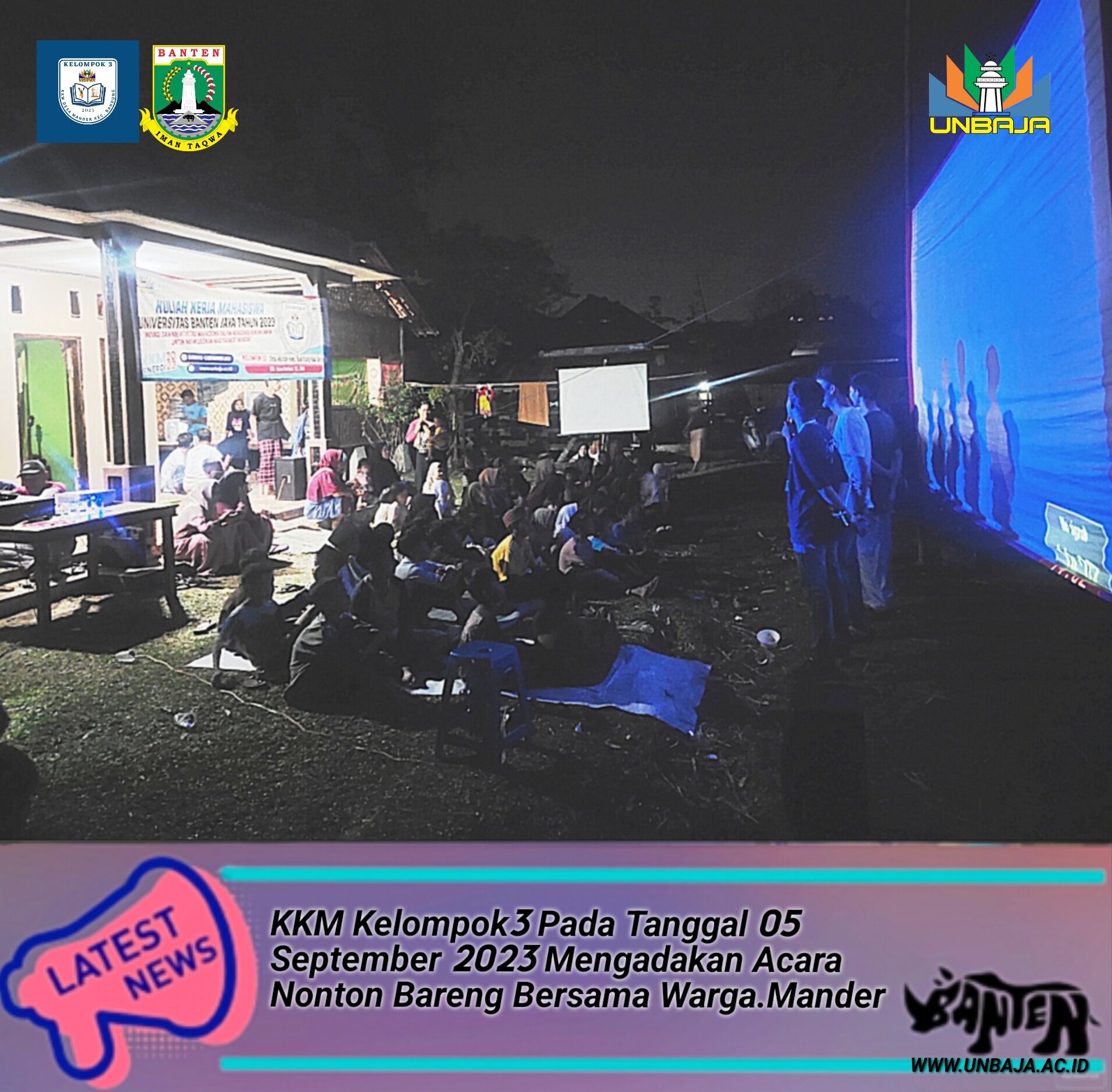 di hari terakhir ini tepatnya pada selasa tanggal 05 September 2023 kami mahasiswa universitas Banten jaya dari KKM kelompok3 berinisiatif mengadakan acara nonton dan makan bareng bersama Warga desa.mander acaranya sangat seru, menghibur banyak warga di buat tertawa karena filmnya yang di putar sangat lucu,tapi di balik keseruan malam ini,kami kakak-kakak mahasiswa sangat gelisah,Bingung,sedih karena esok kami tidak dapat lagi menemani aktivitas warga desa.mander jadi malam ini kita nonton dan makan-makan bareng sekaligus kami ijin pamit karena kami kakak-kakak mahasiswa harus melanjutkan tugas kuliah kami di Universitas Banten jaya,doakan kami ya.