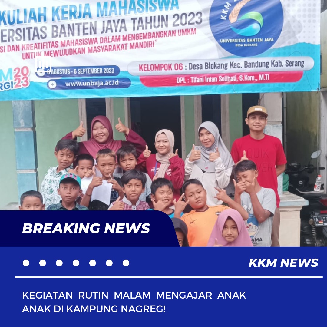 BANTEN, Agustus 2023 Di kampung Nagreg, Desa Blokang, Kecamatan Bandung, Kabupaten Serang, Provinsi Banten. setiap malam sekelompok pemuda dan pemudi berkumpul di sebuah posko untuk mengajar anak-anak di kampung tersebut. Kegiatan ini sudah berjalan dari awal kkm di mulai yaitu di tanggal 9 Agustus 2023 dan menjadi rutinitas bagi para pemuda dan pemudi tersebut sampai KKM berakhir. Kegiatan ini bermula dari kepedulian para pemuda dan pemudi tersebut terhadap pendidikan anak-anak di kampung tersebut. Mereka melihat bahwa banyak anak-anak tidak memiliki kesempatan untuk belajar. Hal ini disebabkan oleh berbagai faktor. Melalui…