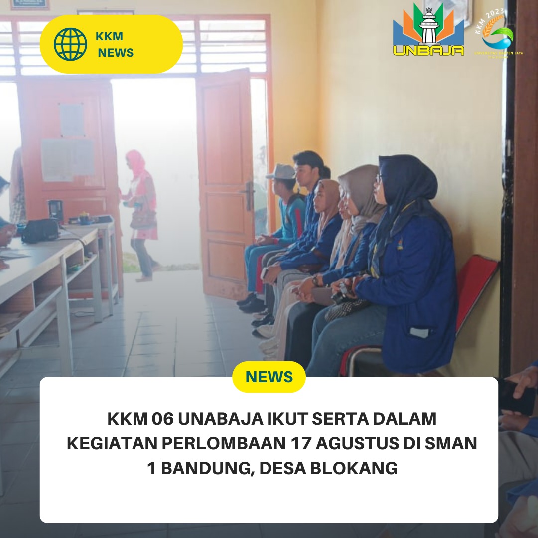 KKM 06 UNABAJA Ikut Serta Dalam Kegiatan Perlombaan 17 Agustus di SMAN 1 Bandung, Desa Blokang Desa Blokang, Kabupaten Serang, Banten, menggelar kegiatan perlombaan 17 Agustus 2023 di SMAN 1 Bandung, pada Rabu, 16 Agustus 2023. Kegiatan ini diikuti oleh seluruh siswa-siswi SMAN 1 Bandung, termasuk mahasiswa Kuliah Kerja Mahasiswa (KKM) Kelompok 6 Universitas Banten Jaya (UNBAJA) yang berkolaborasi dengan OSIS dan menjadi panitia. Dalam kegiatan ini, mahasiswa KKM 06 UNABAJA turut berpartisipasi pada setiap lomba. Selain itu, mahasiswa KKM 06 UNABAJA juga turut membantu panitia dalam menyiapkan berbagai keperluan…