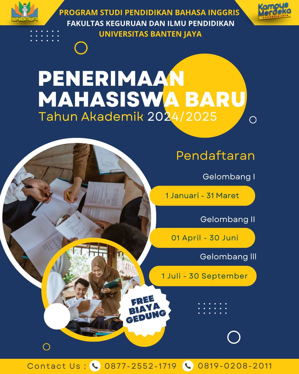 Prodi Pendidikan Bahasa Inggris atau Jurusan Pendidikan Bahasa Inggris di UNBAJA ( Universitas Banten Jaya) Kota Serang Banten merupakan salah satu prodi terbaik di Kota Serang Banten Terakreditasi “B”, Prodi Pendidikan Bahasa Inggris menjadi pilihan tepat buat Anda karena memiliki prospek yang sangat baik saat ini dan juga dimasa yang akan datang. Jurusan atau Prodi Pendidikan Bahasa Inggris selain memiliki banyak sekali keuntungan juga di dukung oleh Dosen-dosen yang sudah ahli dan berpengalaman dibidangnya.