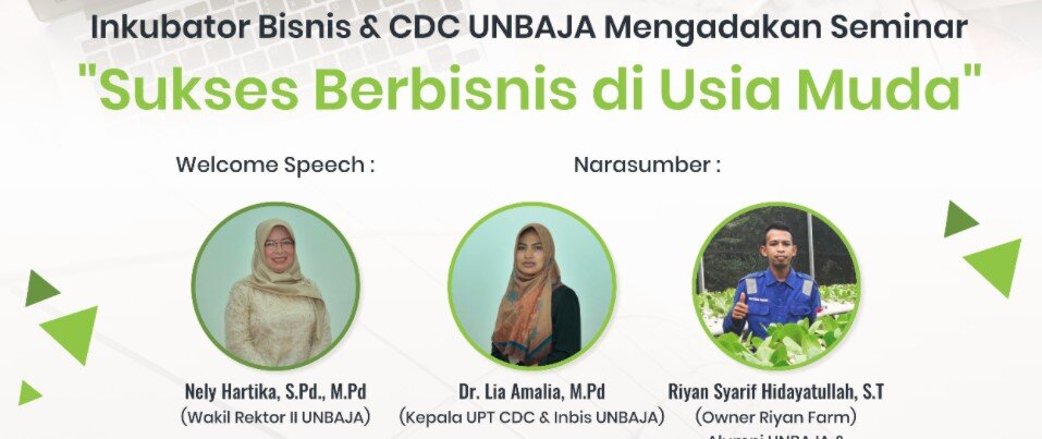 Kegiatan ini dilaksanakan pada Jum`at, 10 Desember 2021 dari pukul 09.00-11.00 WIB. Webinar diikuti lebih dari 150 peserta yang berasal dari kalangan guru, siswa-siswi SMA/SMK, para mahasiswa dan alumni UNBAJA, para penggiat UMKM dan umum di Provinsi Banten. Pada acara ini CDC-Inbis UNBAJA menghadirkan dua pembicara, yaitu Dr. Lia Amalia, M.Pd selaku kepala UPT. CDC-Inbis sekaligus owner dari Rhamala Hijab serta seorang alumni Universitas Banten Jaya dari program studi Teknik Lingkungan yang sukses dalam meniti karirnya sebagai seorang wirausahawan dibidang pertanian yaitu hidroponik Riyan Syarif Hidayatullah, ST selaku owner dari Riyan Farm