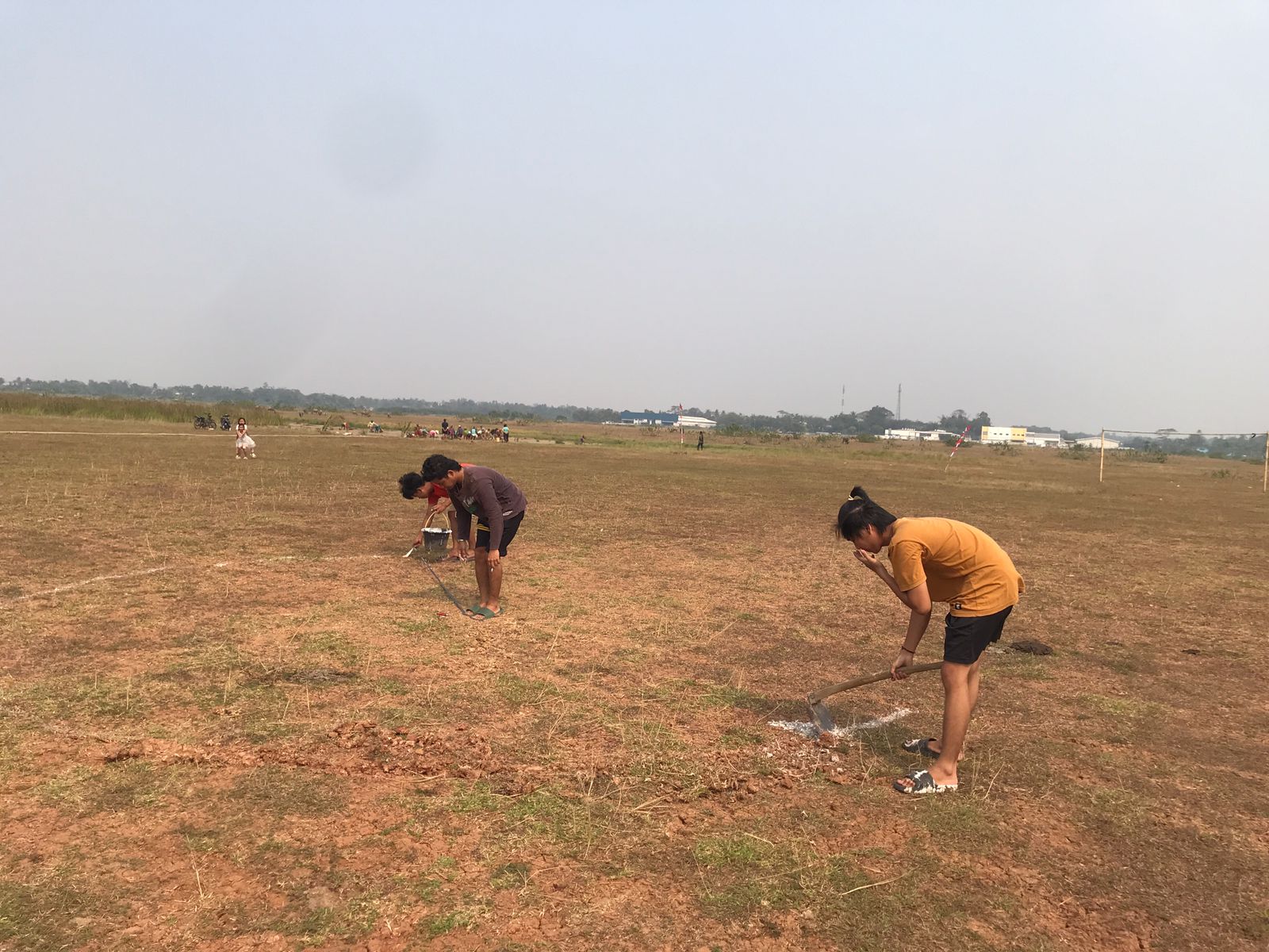 Langkah pertama adalah membersihkan lapangan dari segala jejak kemarin. Para anggota KKM dan warga bergotong-royong membersihkan rumput. Tidak hanya sekadar bekerja, mereka juga berbincang dan tertawa bersama, menghilangkan batas antara anggota KKM dan warga.
