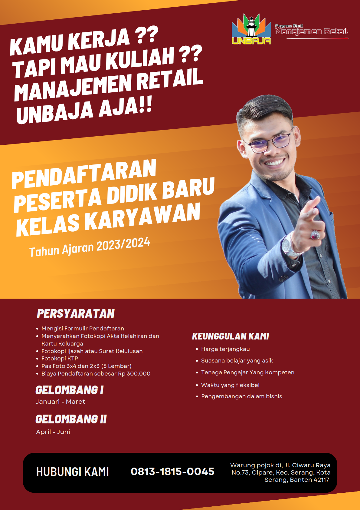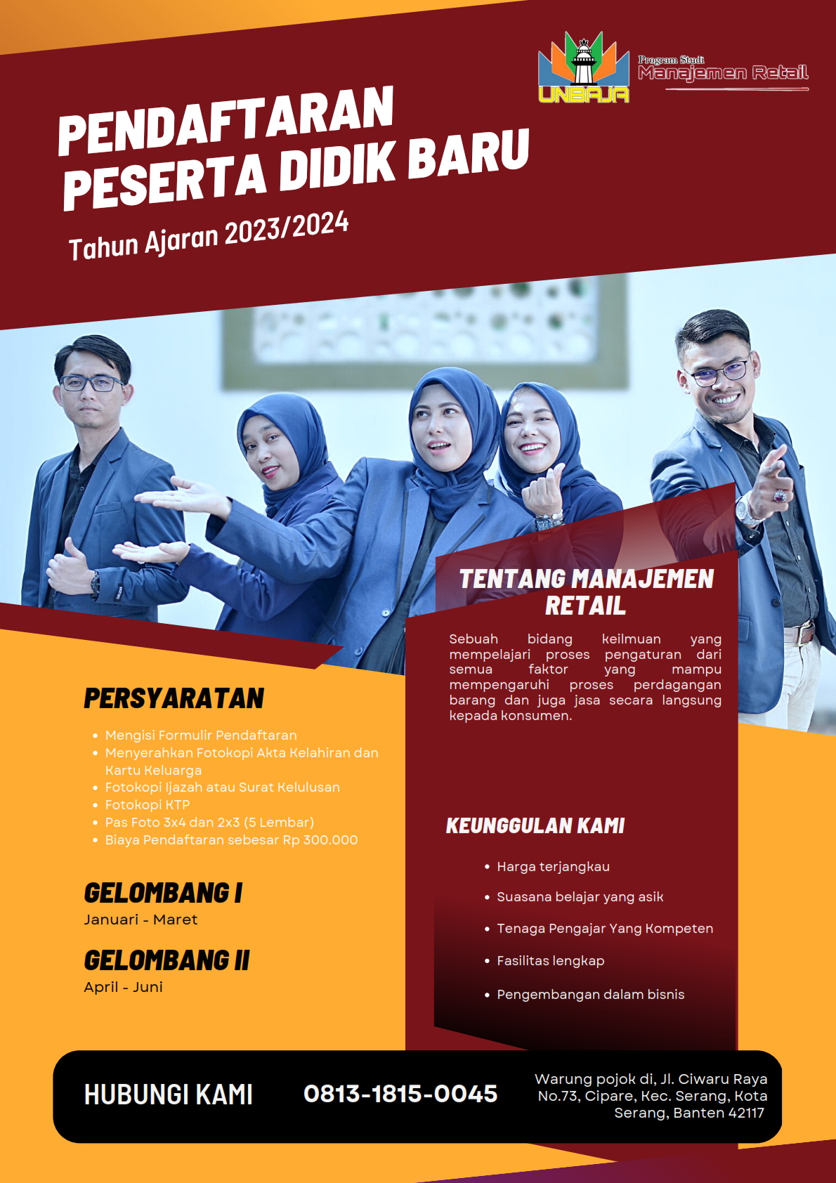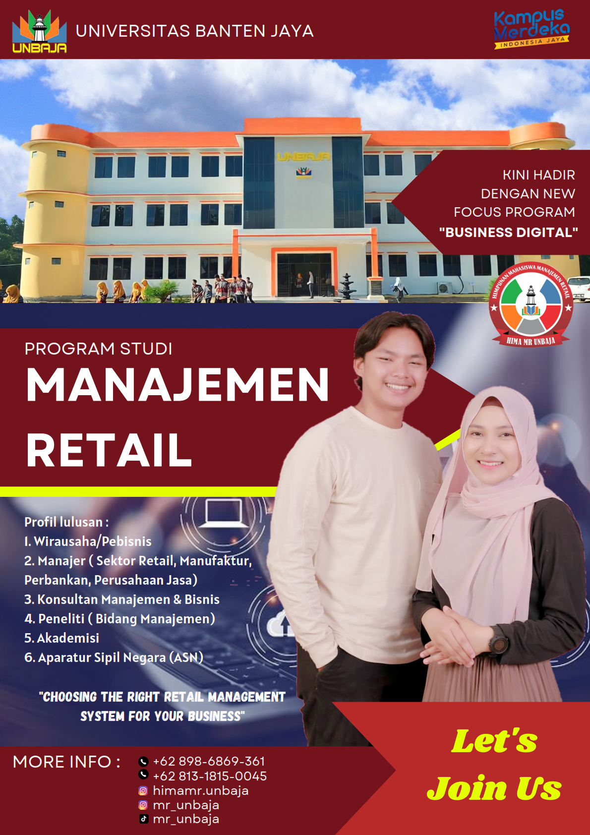 Program Studi Manajemen Retail (S1) Universitas Banten Jaya Kota Serang Banten, gelar ini memberikan keterampilan dan pengetahuan yang mereka butuhkan untuk bekerja dalam posisi kepemimpinan di bidang ritel. Keterampilan ini dapat digunakan untuk memulai sejumlah jalur karir yang berbeda di industri ritel, termasuk manajemen toko ritel, pemasaran, pembelian, dan posisi pengawas di tingkat korporasi. Kurikulum di bidang ini mencakup kombinasi dari retail atau ritel, kepemimpinan dan topik yang terkait dengan bisnis.