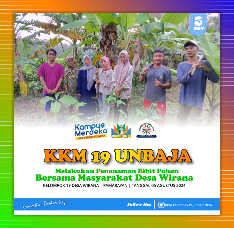 Pada hari Senin, 5 Agustus 2024, Kelompok 19 dari KKM Universitas Banten Jaya (UNBAJA) melaksanakan kegiatan penanaman pohon di Desa Wirana. Acara ini merupakan bagian dari program penghijauan yang diinisiasi oleh UNBAJA.