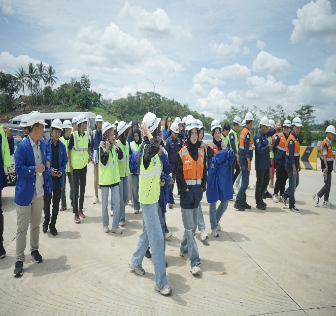 Para peserta kemudian diajak berkeliling mengunjungi beberapa titik pembangunan proyek, di antaranya Gerbang Tol Cikulur, Gerbang Tol Cileles, serta lokasi pembangunan jembatan yang sedang memasuki tahap erection di Exit Tol Cikulur. Pada titik-titik tersebut, mahasiswa dapat melihat langsung proses konstruksi sekaligus berinteraksi dengan tim teknis di lapangan. Antusiasme mahasiswa terlihat jelas saat mereka mengamati penggunaan alat berat, metode pelaksanaan pekerjaan mulai dari pembesian hingga pengecoran jalan, serta sistem manajemen keselamatan kerja yang diterapkan..