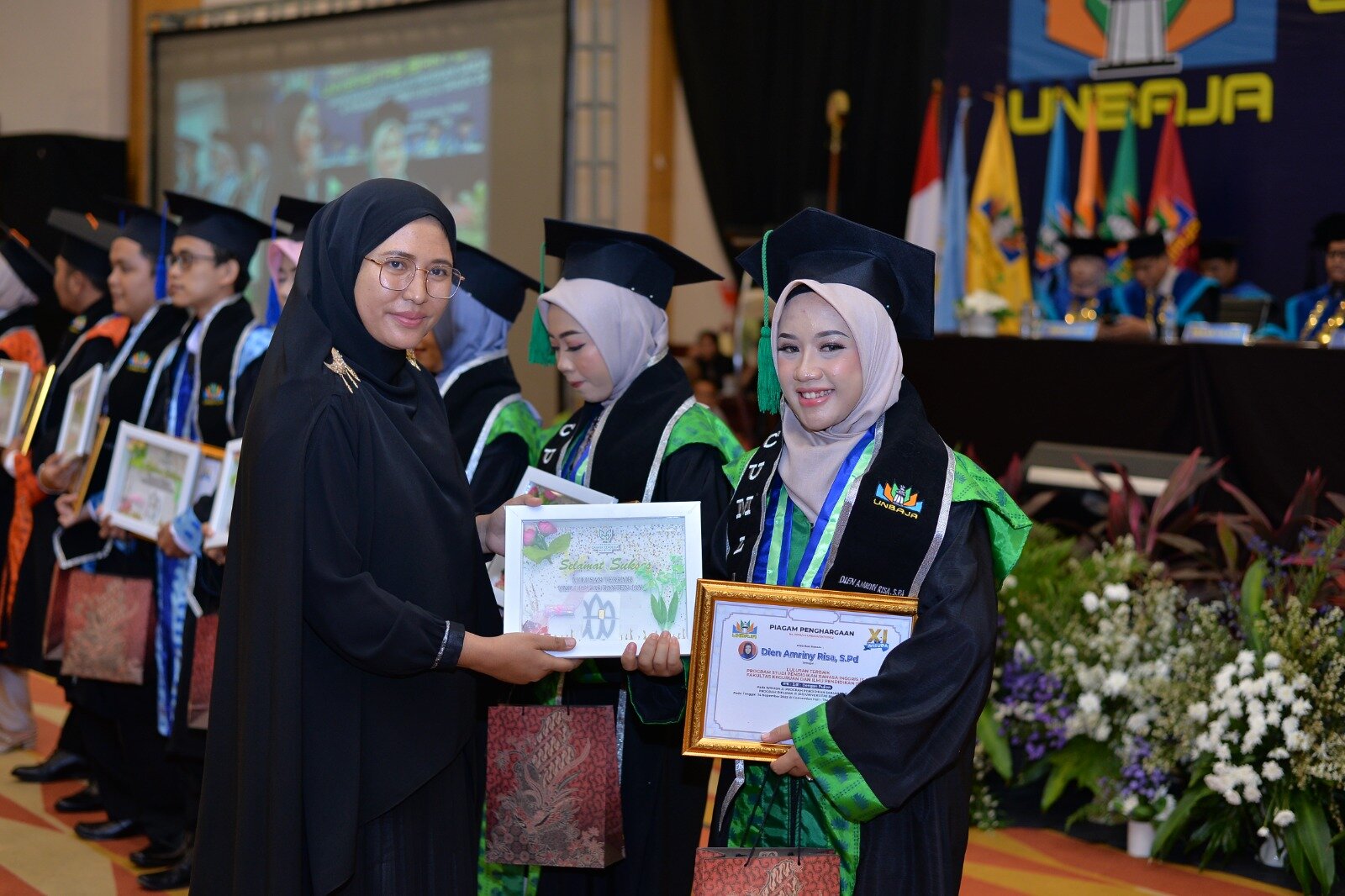 Kepala Program Studi Manajemen Retail (S1) Asih Kurnianingsih, SE MM memberikan paigam penghargaan kepada para wisudawan terbaik Universitas Banten Jaya. Acara widawan Universitas yang Ke-6 ini di selenggarakan di Ball Room Hotel The Royal Krakatau, Senin 19 Desember 2022.