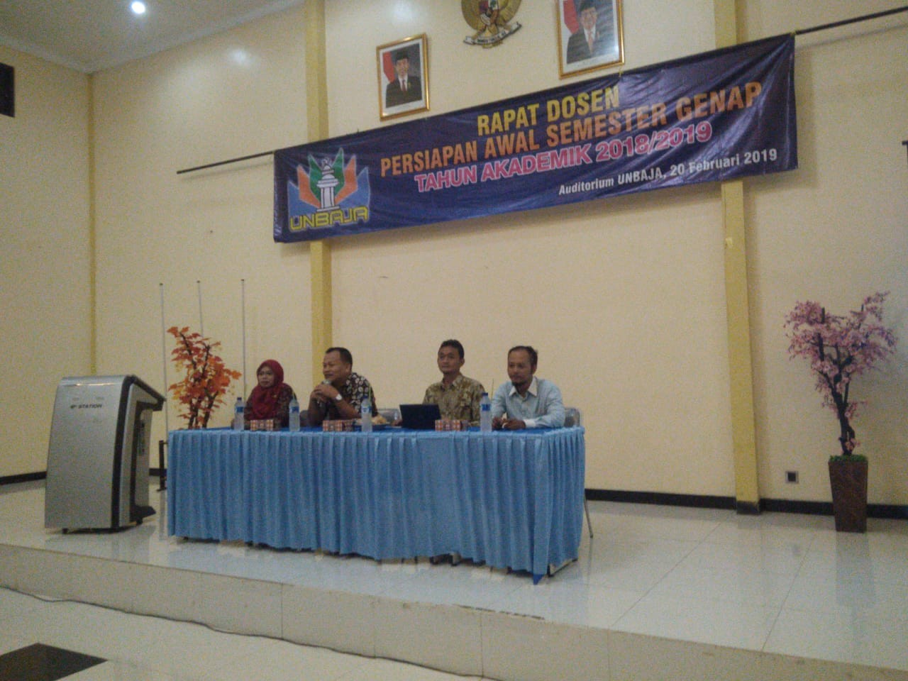 UNBAJA (20/2) Dalam upaya menuju pencapaian visi UNBAJA menjadi Universitas yang bermutu, inovatif dan berbasis karakter pada 2021, Dr. Sudaryono, Rektor UNBAJA periode 2017-2021 menggelar Rapat dosen persiapan awal semester genap Tahun Ajaran 2018/2019 yang dilaksanakan di Auditorium UNBAJA Kampus 1, Warung Pojok, Serang Rabu, 20  Februari 2019.
