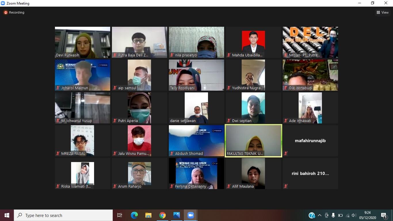 Program Studi Teknik Sipil Fakultas Teknik UNBAJA mengadakan kegiatan Webinar bekerjasama dengan PT Putra Baja Deli sebagai produsen baja tulangan konstruksi. Kegiatan berlangsung pada hari Sabtu, tanggal 05 Desember  2020 dengan media zoom meeting, diikuti oleh 71 mahasiswa Teknik Sipil semester 3, 5 dan 7. Dibuka oleh Frebhika Sri Puji Pangesti sebagai Dekan Fakultas Teknik UNBAJA dan sebagai Ketua Pelaksana adalah Telly Rosdiyani. Adapun tema webinar adalah “ Production Process and Tensile Procedure of Steel Bar and Ensuring The Validity of Result”. Materi disampaikan oleh Mislan dan Noviardi  dari PT. Putra Baja Deli dengan dimoderatori oleh M. Ichwanul Yusup (Dosen Tetap Teknik Sipil UNBAJA). Diharapkan dengan mengikuti kegiatan webinar ini mahasiswa akan bertambah pengetahuannya mengenai jenis-jenis,  material, kekuatan dan penggunaan baja tulangan konstruksi . Kerjasama antara Prodi Teknik Sipil UNBAJA dengan PT Putra Baja Deli telah berlangsung dari tahun 2017 dengan penandatanganan MOU.