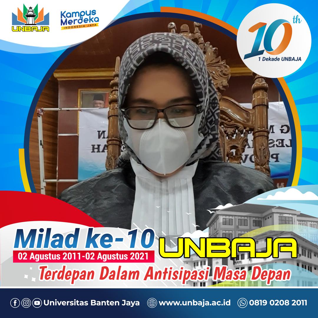 Saya Rina Dewiyanti, M.Si Kepala Badan Pengelolaan Keuangan dan Aset Daerah Provinsi Banten, pada usia satu dasawarsa Universitas Banten Jaya turut bangga atas hadirnya perguruan tinggi di Provnsi Banten untuk dapat membantu Pemerintah Provinsi Banten dalam melahirkan berbagai inovasi demi kejayaan Provinsi Banten