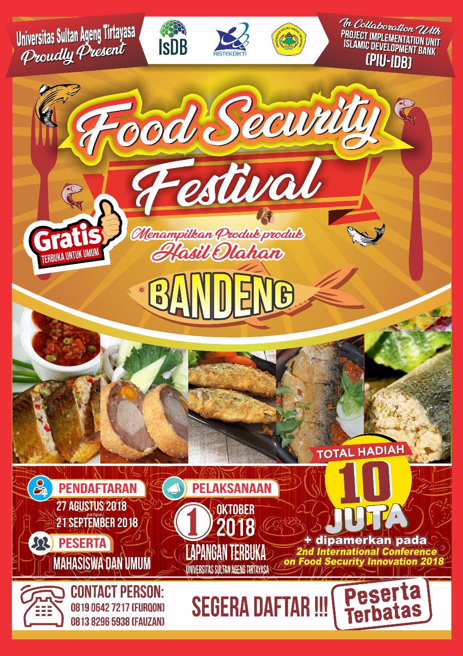 Yuuuk ikuti Food Security Festival 2018 yang melibatkan ahli di bidang pangan dan kuliner, Dinas Pendidikan dan Dinas Pariwisata Provinsi Banten. Pendaftar akan diseleksi sebanyak 25 peserta untuk mengikuti Food Security Festival 2018 dan selanjutnya akan ditentukan 5 peserta yang memiliki keunggulan dimana produknya akan dipamerkan di kegiatan 2nd Internasional Conference on Food Security Inovation 2018. (Humas)
